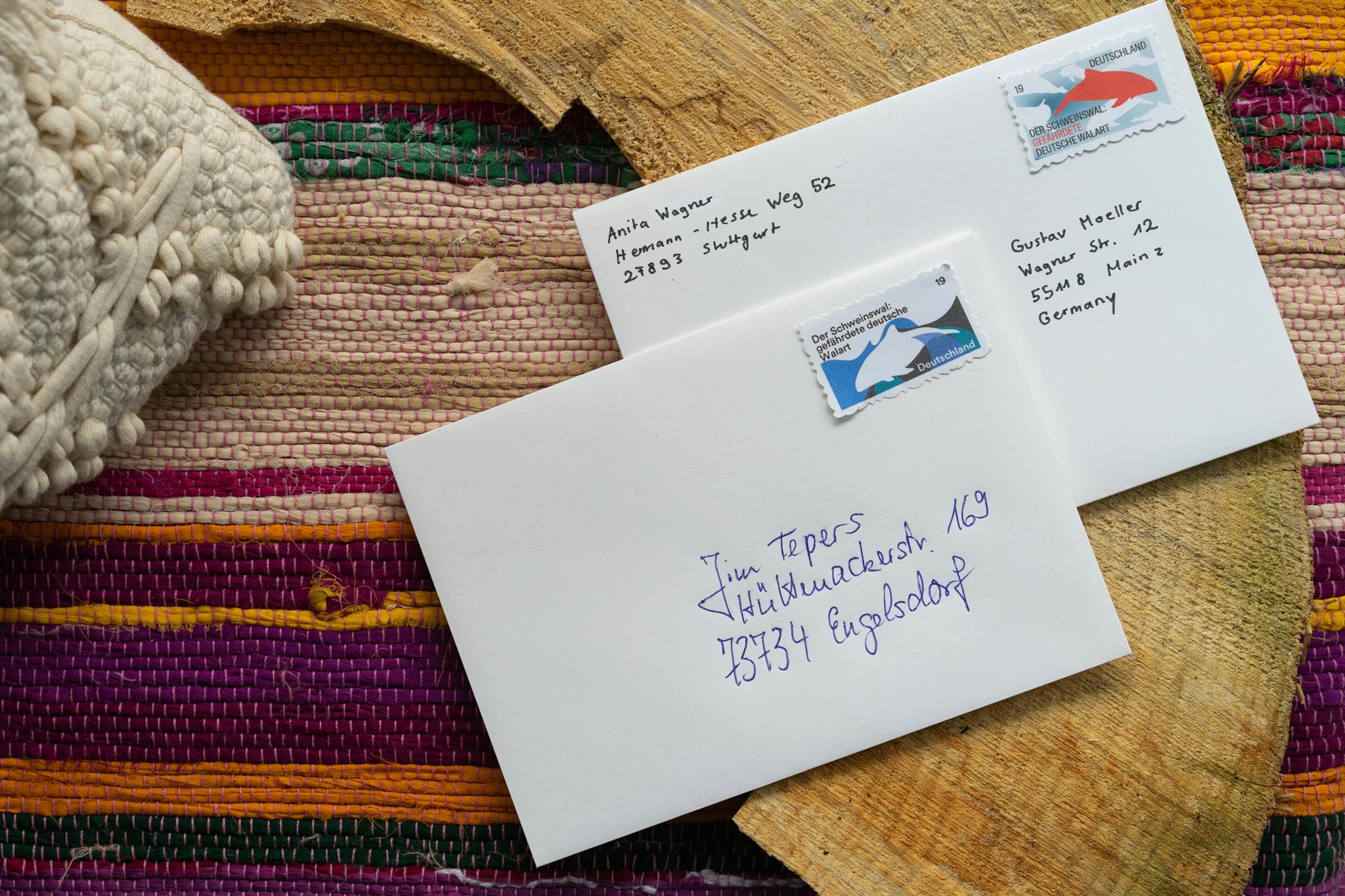 Während meines Praktikums bei Surface Grafik entwarf ich Briefmarken für einen Wettbewerb. Für eine Sondermarke sollte die erste mehr Aufmerksamkeit auf den vom Aussterben bedrohten Schweinswal bringen. Bei der zweiten Marke handelt es sich um eine Reihe, die sich mit deutschen Fledermaus-Arten befasst.